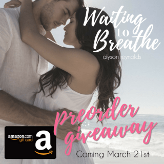 Alyson Reynolds is hosting a pre-order giveaway for a signed paperback copy of WAITING TO BREATHE and a $10 Amazon gift card!