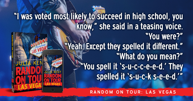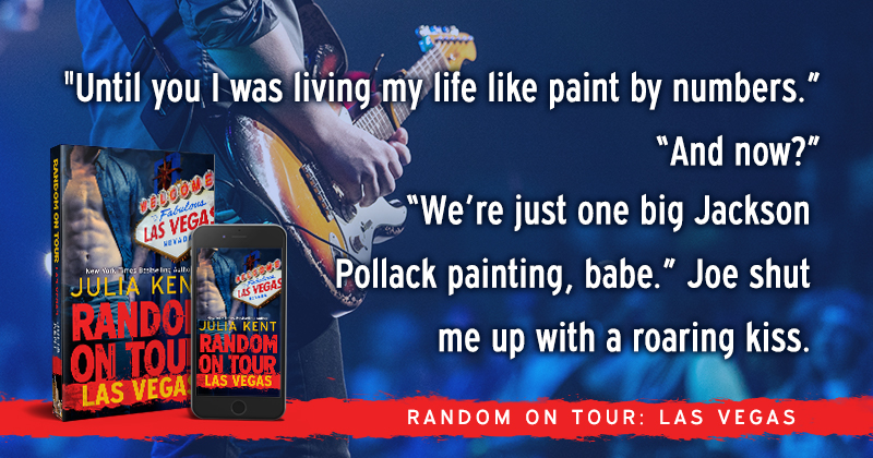 Random on Tour: Las Vegas is the 9th book in Julia Kent’s New York Times bestselling Random series. When the band performs in Vegas, anything goes – including Darla’s dignity and all of the band’s savings. When a savior appears, though, there’s a trade-off for being rescued. A big one. How far is Darla willing to go?