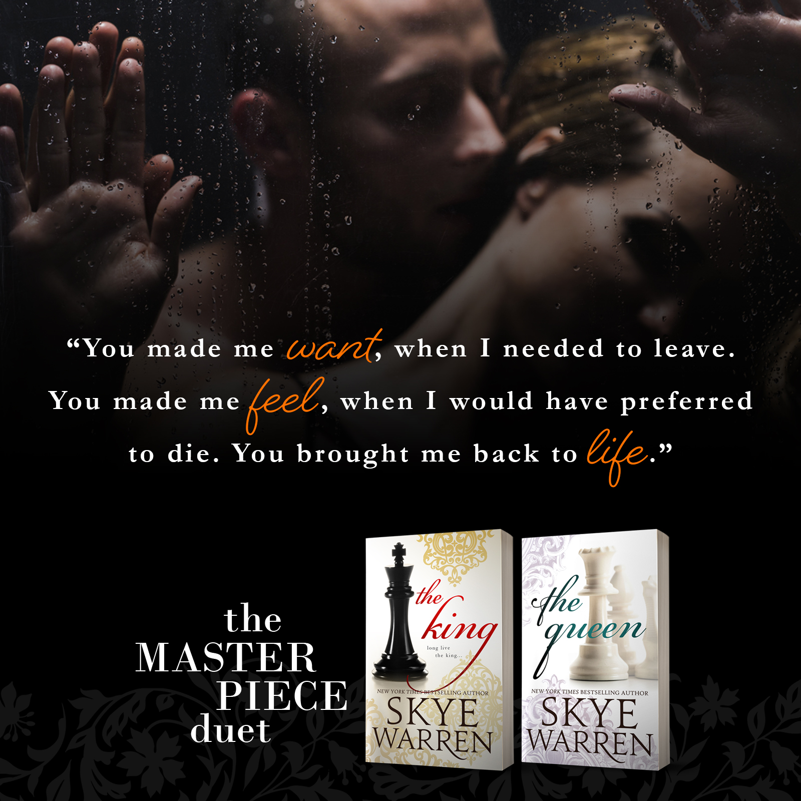 He answers the same way, a surly teenage boy, fierce and vulnerable at once. “You made me care. You made me want, when I needed to leave. You made me feel, when I would have preferred to die. You brought me back to life.”